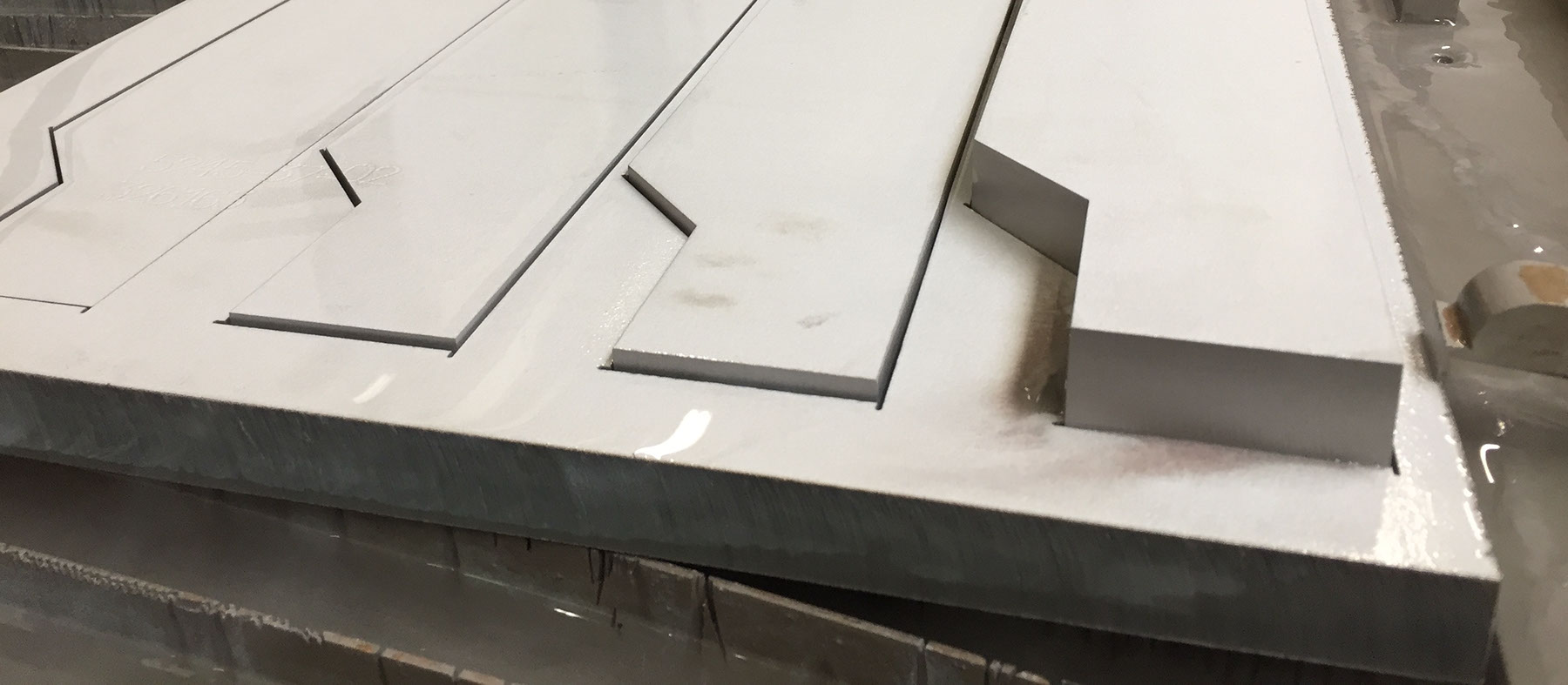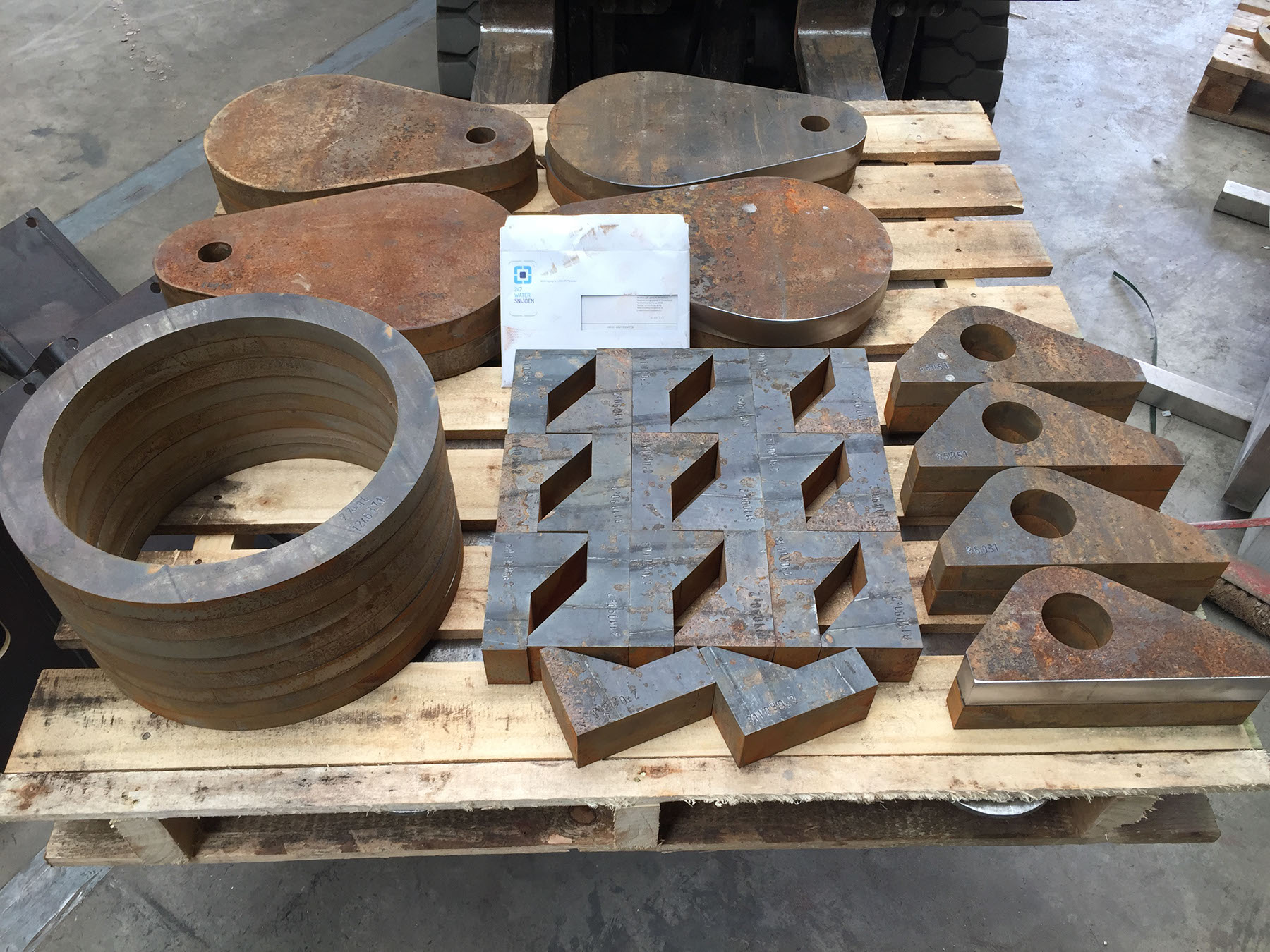 Als jullie ons de opdracht gunnen halen wij de materialen uit onze courante voorraad of bestellen wij deze bij een van onze vertyrouwde leveranciers, hierna het werk gaan watersnijden met een van onze drie watersnijmachines. OMAX 3000x1500, OMAX 4000x2000 of de OMAX 6000x2000. Met 4000bar ( 900KM p.uur) snijden wij de contouren van uw producten en zorgen wij voor de gewenste kwaliteit.